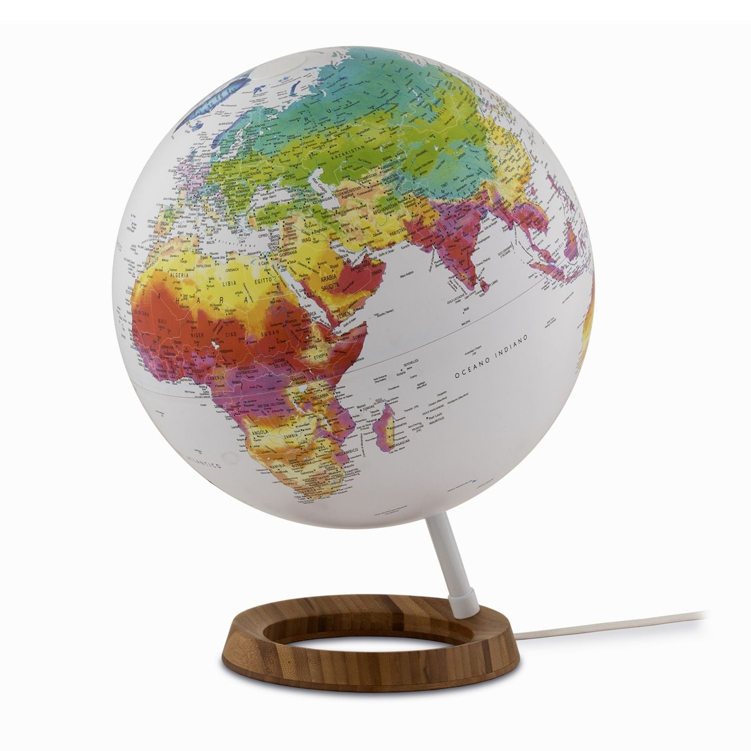 Die Kugel hat einen Durchmesser von 25 cm. Dank des innovativen Designs des Gestells aus Aluminium scheint die Kugel über dem ringförmigen Fuß aus Bambusholz zu schweben. Die Neigung der Achse entspricht dabei der tatsächlichen Neigung der Erdachse. Die Gesamthöhe des Globus ist 40 cm.
